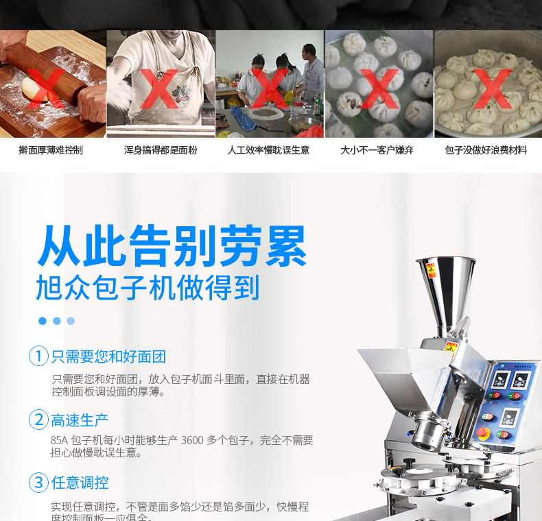 名稱XZ-85A全自動包子機 電源220/380V 功率2.4kw 產量0-3000個/h 尺寸1600×720×1600mm 重量390kg 規格20-150g/個 其他