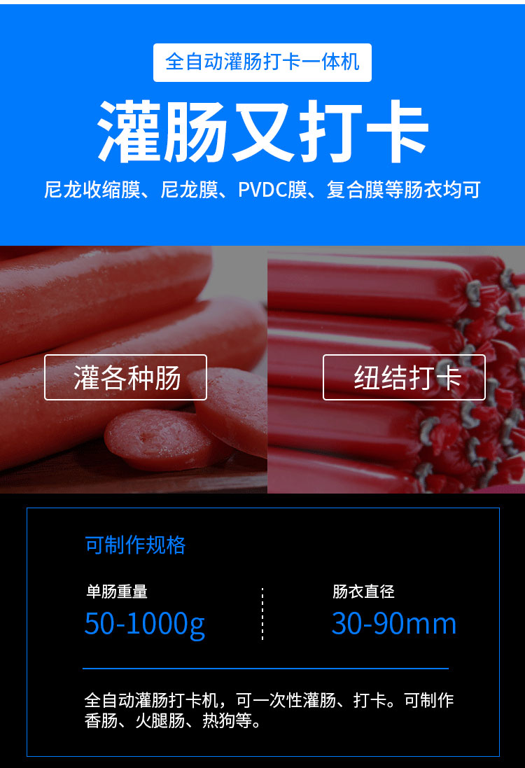 旭眾牌XZ-II型鋁絲雙卡自動打卡機采用先進的技術,運用氣動,電光控制原理可連續自動定量灌制各種肉食腸,操作簡單,維護方便,準確性高,重復性好,可加裝旋轉雙出料管機構,縮短套腸衣的輔助時間。是一種高效率,易操作的理想設備。整機采用優質不銹鋼材料制成,外形美觀,結構緊湊合理,密閉防水,易于清洗。