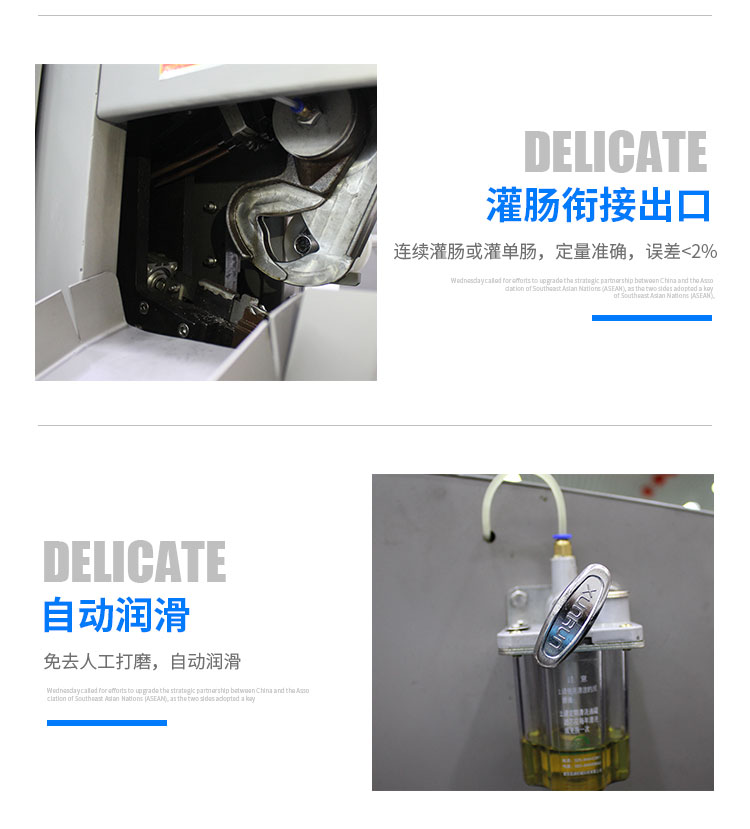 旭眾牌XZ-I型自動定量灌腸機是在吸收國內外先進技術基礎上自行研制的專利產品,采用先進的氣動,電光控制原理,配有微電腦控制,封口嚴緊,灌裝飽滿程度可調,扣形美觀,質量可靠,結構合理,性能可靠,操作簡單,維護方便,是肉制品加工的理想設備。
