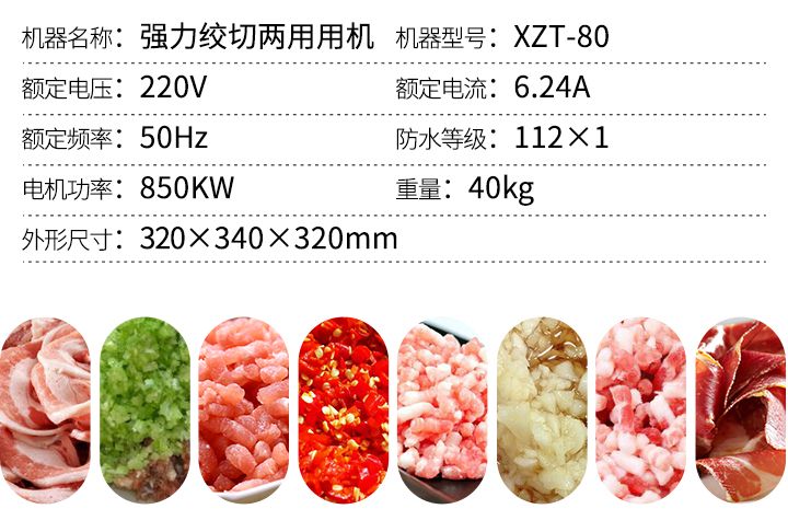 名稱XZT-80絞切機 電源220V 功率850/1100W 產量250kg/h 尺寸320×360×320mm 重量45kg 規格 其他