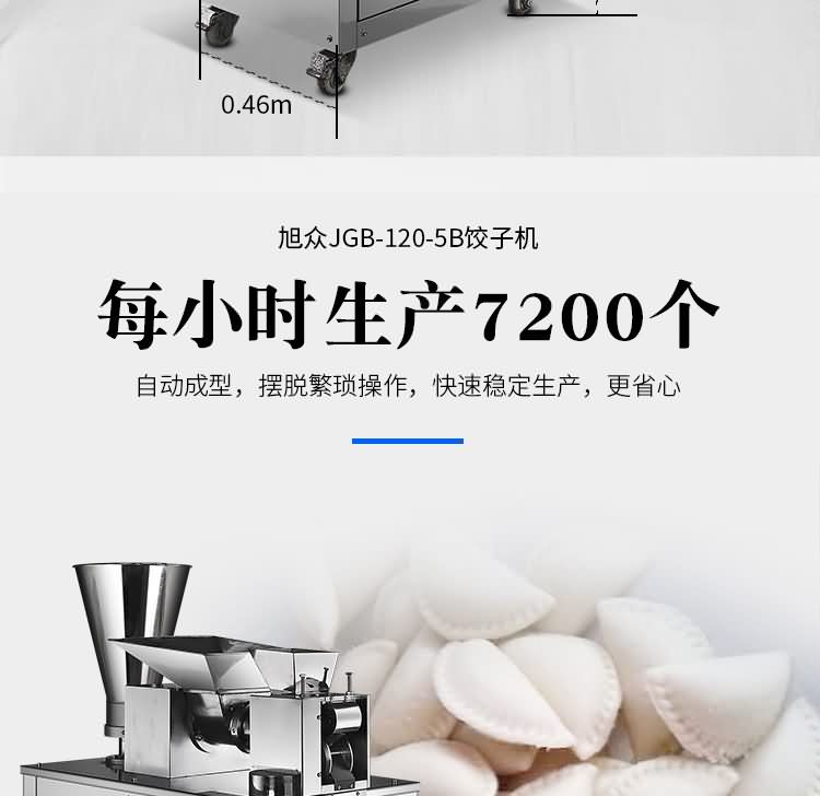 名稱JGB-120-5B型餃子機(jī) 電源220/380V(見(jiàn)機(jī)器名牌) 功率2.2kw(220V)1.5KW(380V) 產(chǎn)量7200個(gè)/小時(shí) 尺寸770×460×1190mm 重量200kg 規(guī)格15-20克/個(gè) 其他