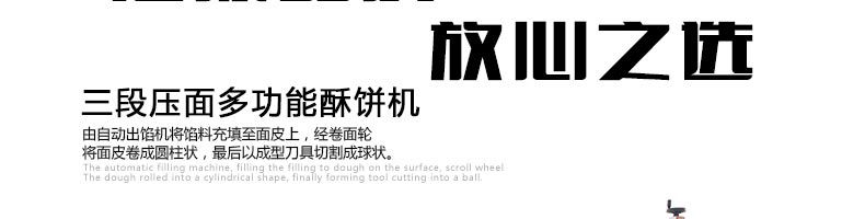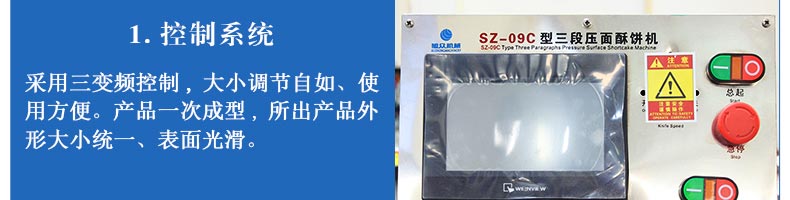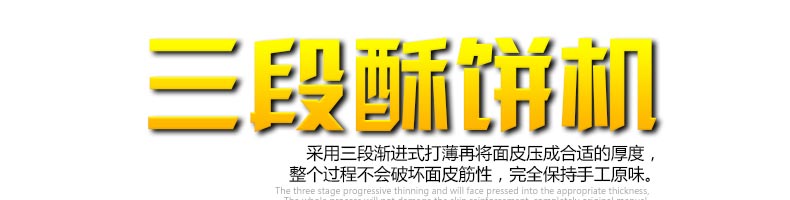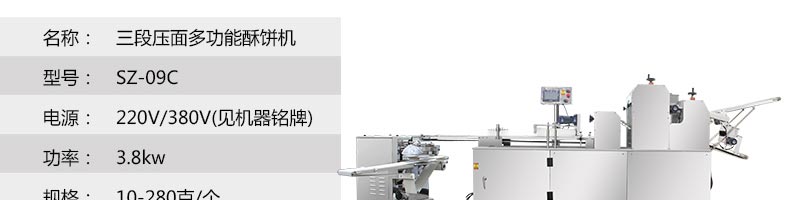 名稱SZ-09C三段壓面酥餅機 電源220/380V(見機器名牌) 功率3.8kw 產量0-3600個/小時 尺寸3200×840×1630mm 重量700kg 規格10-100克/個 其他