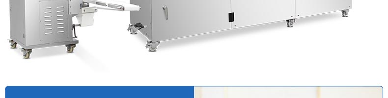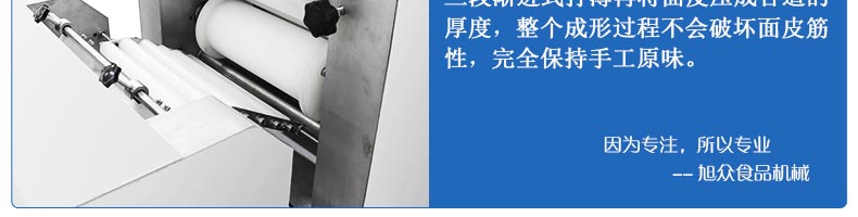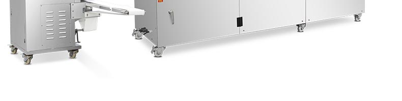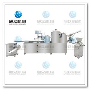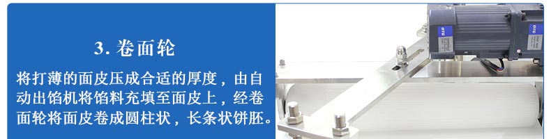 旭眾牌SZ-09C多功能三段酥餅機采用三段漸進式打薄再將面皮壓成合適的厚度。由自動出餡機將餡料充填至面皮上,經卷面輪將面皮卷成圓柱狀,最后以成型刀具切割成球狀。長條狀餅胚,整個成形過程不會破壞面皮筋性,保持手工原味。