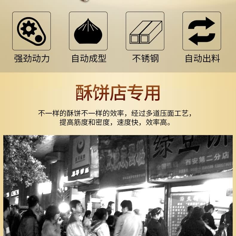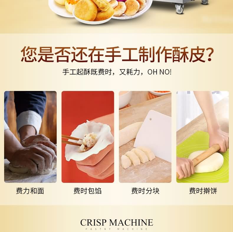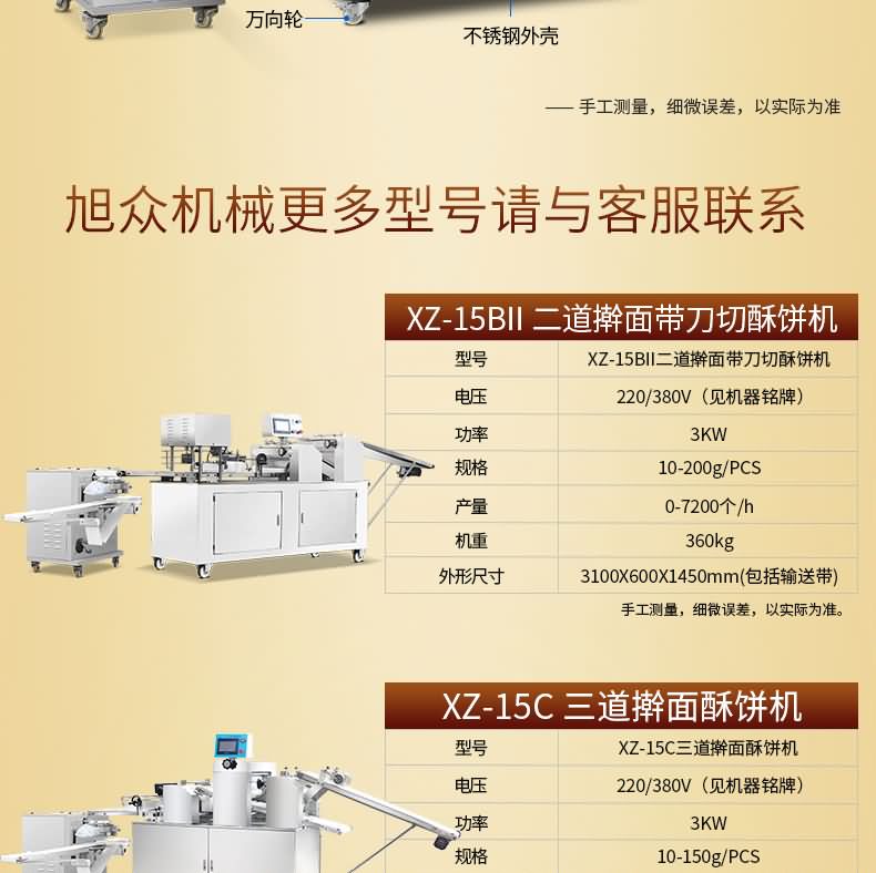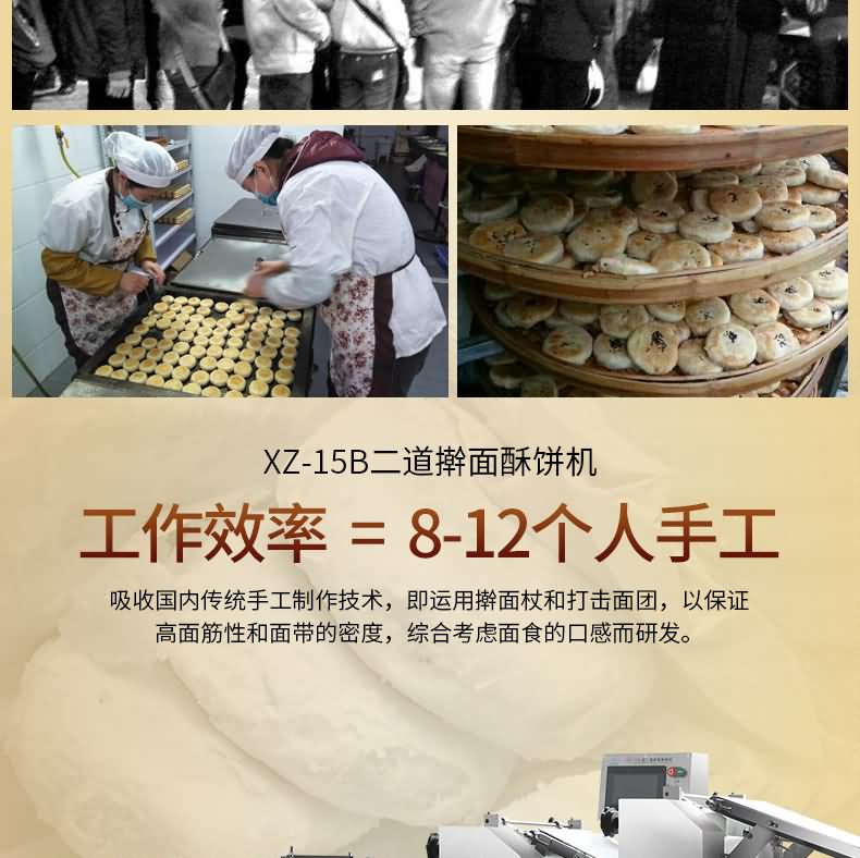 旭眾牌XZ-15B二道搟面酥餅機(jī)是我公司仿手工制作面食產(chǎn)品的機(jī)型,占地面積小,重量輕,它吸收國內(nèi)傳統(tǒng)手工制作技術(shù),即運(yùn)用搟面杖壓面和打擊面團(tuán),以保證高面筋性和面帶的密度,并綜合考慮面食的口感而研發(fā)。