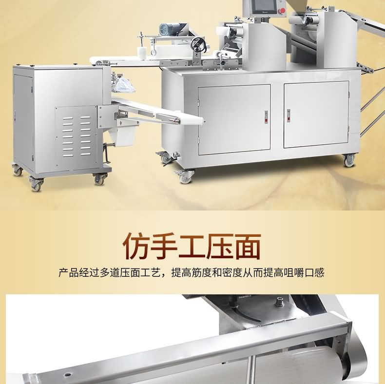 ?生產(chǎn)速度快,效率高,生產(chǎn)流程流暢,各環(huán)節(jié)都輔以電控設(shè)備控制,不會(huì)出現(xiàn)堵面,破酥等現(xiàn)象;