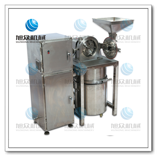 不銹鋼除塵粉碎機,全不銹鋼制造,304材質,符合GMP要求。主要適用于制藥、化工、食品等行業的物料粉碎。本機利用活動齒盤和固定齒盤的相對運動,以及物料之間的相互撞擊作用,從而使粉碎腔內的物料獲得破碎、粉碎。本機配備篩網,篩網可以根據客戶要求進行更換,當物料被粉碎到小于篩孔直徑時,粉劑從篩網中出來,落入下方的集料桶內,在桶內飄揚的粉塵則通過除塵電機的作用被吸入到除塵箱內的除塵袋中過濾,空氣由風機排出室外。