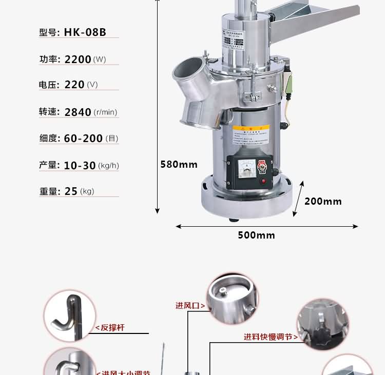 名稱HK-08B流水式粉碎機 電源220V 功率2.2kw 產(chǎn)量5-30kg/h 尺寸500×200×580mm 重量25kg 規(guī)格60-20目 其他