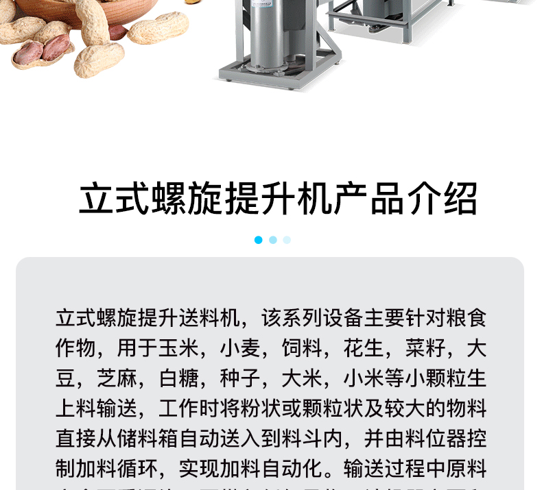 立式螺旋提升送料機,該系列設備主要針對糧食作物,用于玉米,小麥,飼料,花生,菜籽,大豆,芝麻,白糖,種子,大米,小米等小顆粒生上料輸送,工作時將粉狀或顆粒狀及較大的物料直接從儲料箱自動送入到料斗內,并由料位器控制加料循環,實現加料自動化。輸送過程中原料不受污染,不帶入任何異物。該機器主要和榨油機、飼料機配套使用,減少粉塵、減輕勞動強度,提升勞動效率。料口有圓形或方形可選。