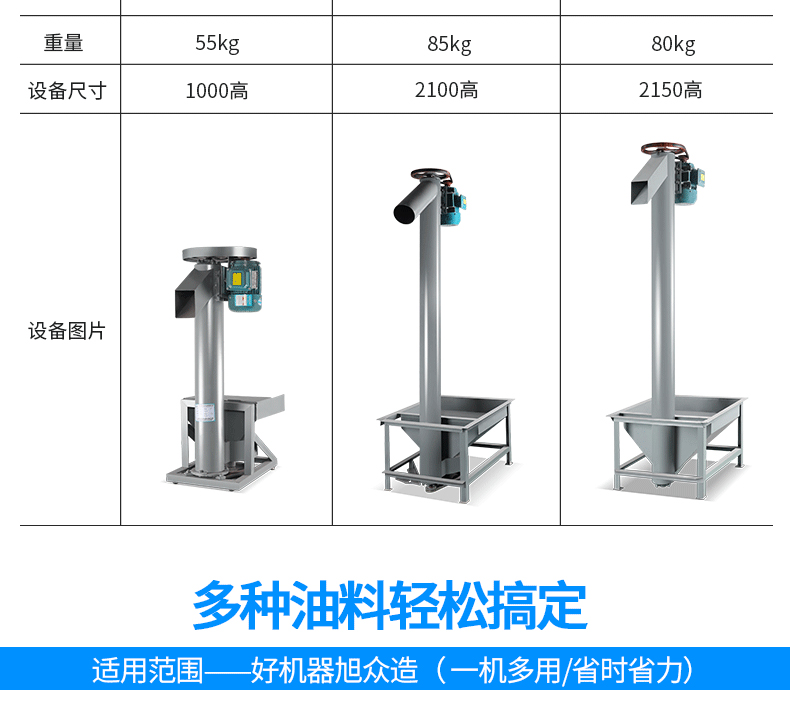 名稱提升機系列 電源380V 功率0.55kw 產量 尺寸高1000mm 重量55kg 規格提升物料:花生、大豆、菜籽、葵花籽、亞麻籽、茶籽等 其他主要用于豆餅提升和裝袋,有自動破碎豆餅功能